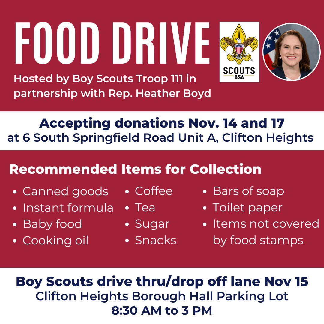 My office is partnering with Boy Scouts Troop 111 for a Food Drive! We’re accepting donations November 14 and 17 at 6 South Springfield Road Unit A, Clifton Heights.