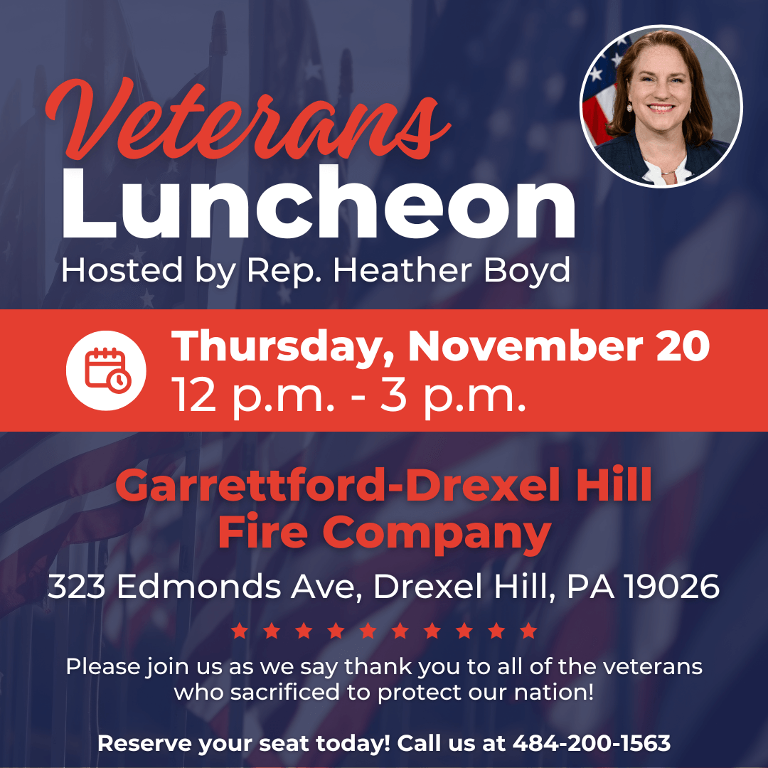 My office is hosting a Veterans Luncheon on Nov. 20 to thank all veterans and their sacrifices to protect our nation! Reserve your seat today by calling 484-200-1563.