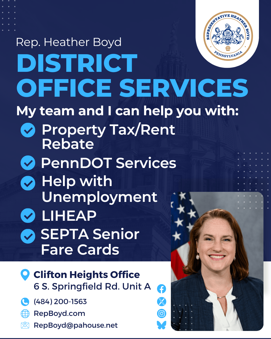 Please stop by my Clifton Heights office (6 S. Springfield Road, Unit A), call us at (484) 200-1563, or email RepBoyd@pahouse.net to learn more about the services we offer and get started!