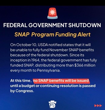 SNAP and LIHEAP benefits may be delayed due to the ongoing federal government shutdown, but you can still apply for the Property Tax/Rent Rebate Program. This program is funded by the Pennsylvania Lottery and gaming revenues.