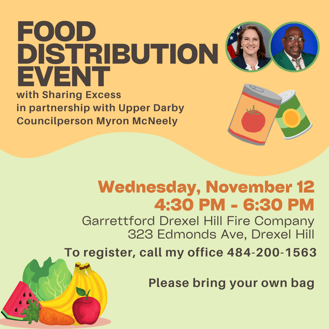 My food distribution event with Sharing Excess and Upper Darby Councilperson Myron McNeely is this Wednesday, Nov. 12. We’re starting at 4:30 and will go until supplies are gone! Stop by the Garrettford Drexel Hill Fire Company (323 Edmonds Ave., Drexel Hill) for food and fresh produce.