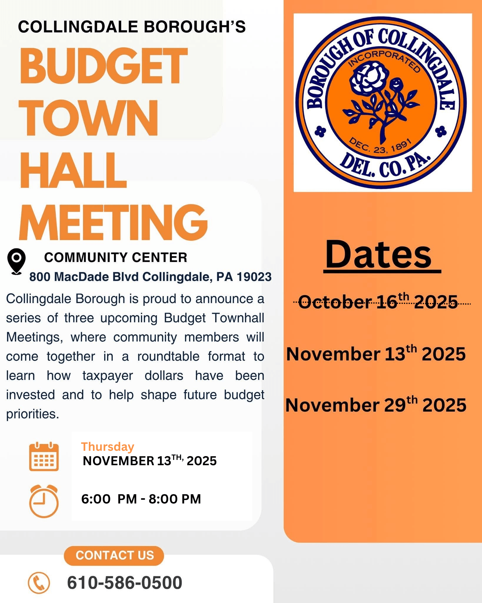 Collingdale Borough’s next Budget Town Hall Meeting is Nov. 13!