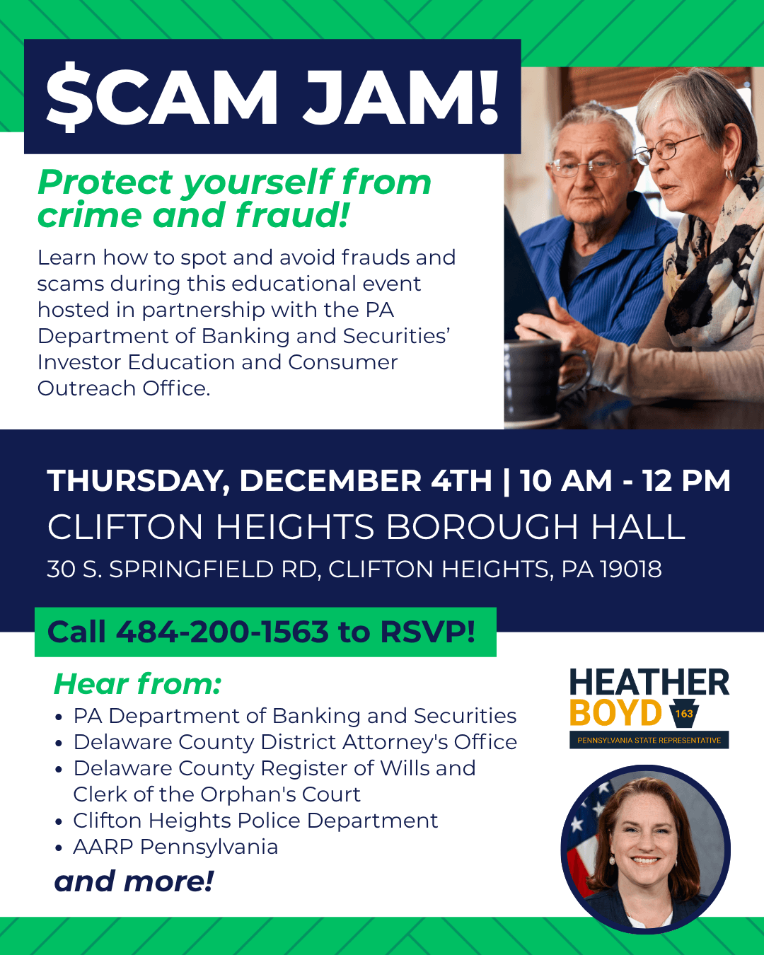 In partnership with the PA Department of Banking & Securities, I’m hosting a $CAM JAM event from 10 a.m. to noon on Thursday, Dec. 4, at Clifton Heights Borough Hall.
