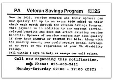 The latest scam targeting veterans’ benefits is more sophisticated than many other tactics. It involves a direct-mail postcard claiming to offer eligible veterans an additional $160 per month through something called the “PA Veteran Savings Program 2025.”