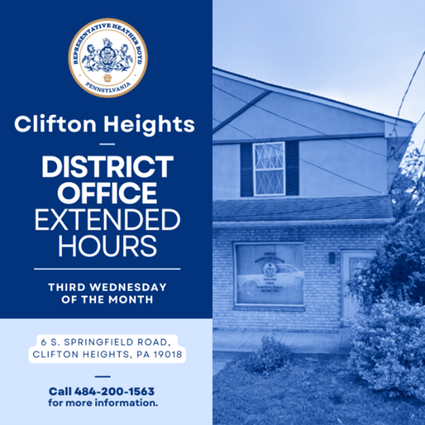 My Clifton Heights office will be open for extended hours from 4:30 p.m. to 7:30 p.m. on Wednesday, December 17, to better serve constituents in the district. Call (484) 200-1563 for more information.