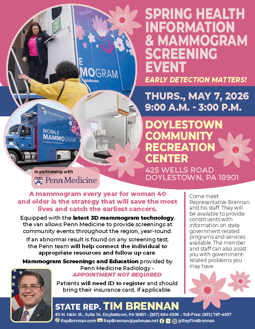 Also on the calendar is a Scam Jam on May 21st, hosted by Sen. Steve Santarsiero and Rep. Perry Warren in partnership with the PA Department of Banking. The event can help teach you to protect yourself from scams and identity theft. Click here for more information on the event.