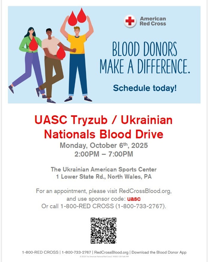 Ukrainian American Sport Center - Tryzub is hosting a semi-annual blood drive in Horsham on October 6, 2025