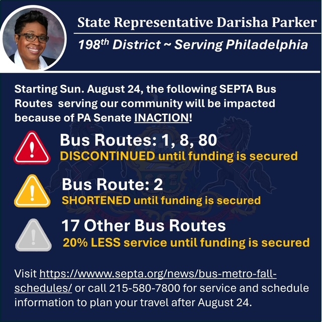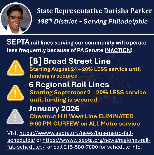 Despite the efforts of my colleagues and I in the House Democratic Caucus, we are still without a budget or legislation that would prevent catastrophic service cuts and fare increases to mass transit agencies like SEPTA, which keep PA connected and moving forward.