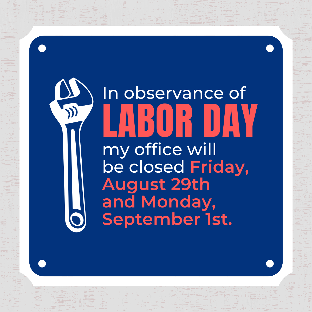My office will be closed tomorrow, August 29, through Monday, September 1, in observance of Labor Day. We will reopen on Tuesday, September 2, to assist with any state government needs.