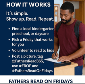 On September 26th, FathersRead365 launches Fathers Read on Friday—a national movement to put fathers, uncles, grandfathers, mentors, and brothers in classrooms across America.