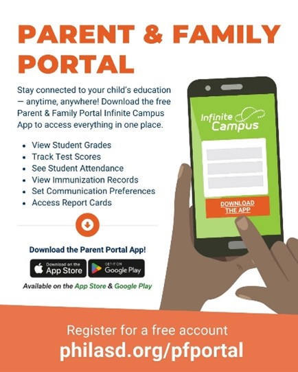 Stay engaged with your child's education anytime by registering for the free Parent & Family Portal on the Infinite Campus App. You can view their grades, track their attendance, and more! Learn more here: Family & Community Engagement (FACE).