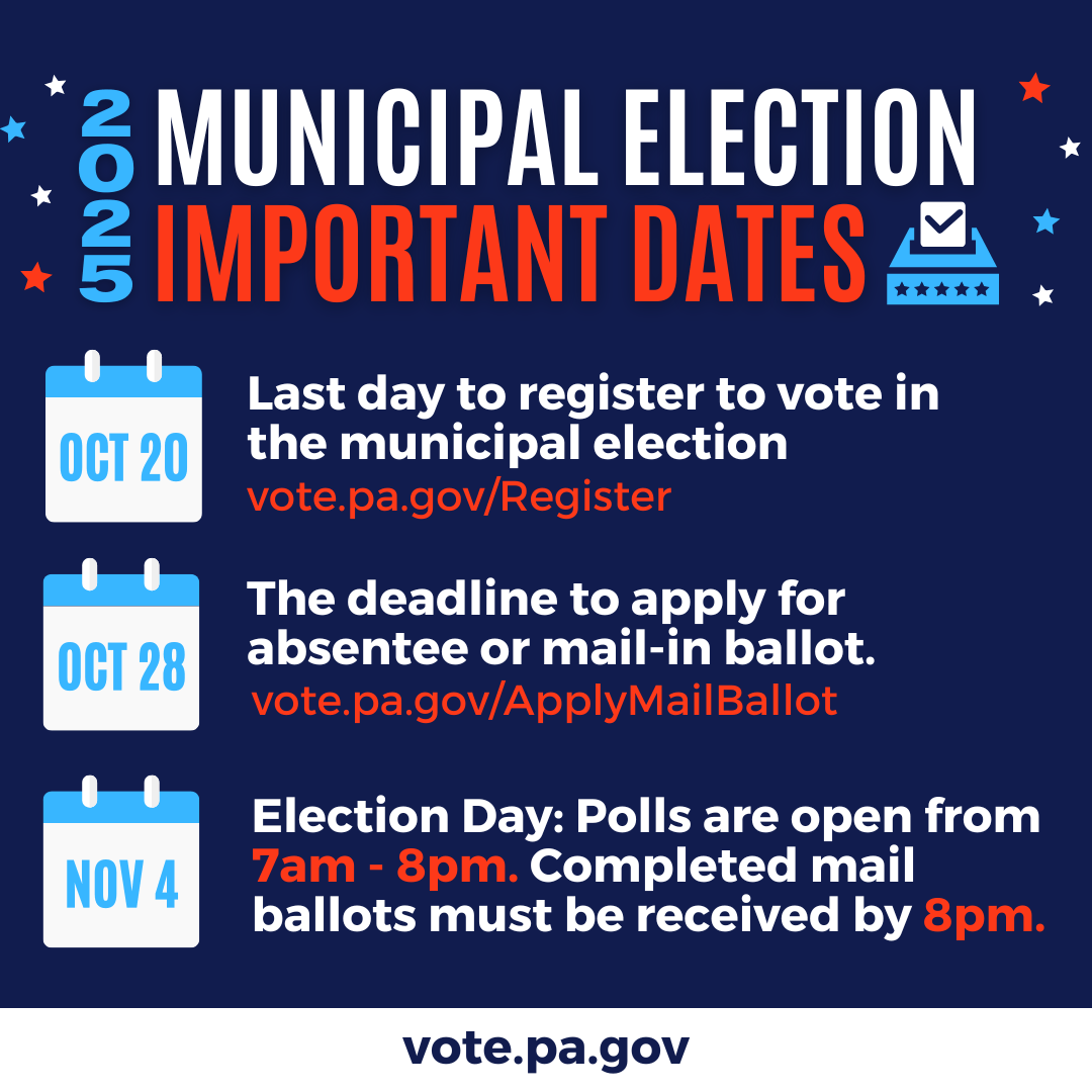 - Tuesday, October 28- Last day to apply for an absentee or mail-in ballot.