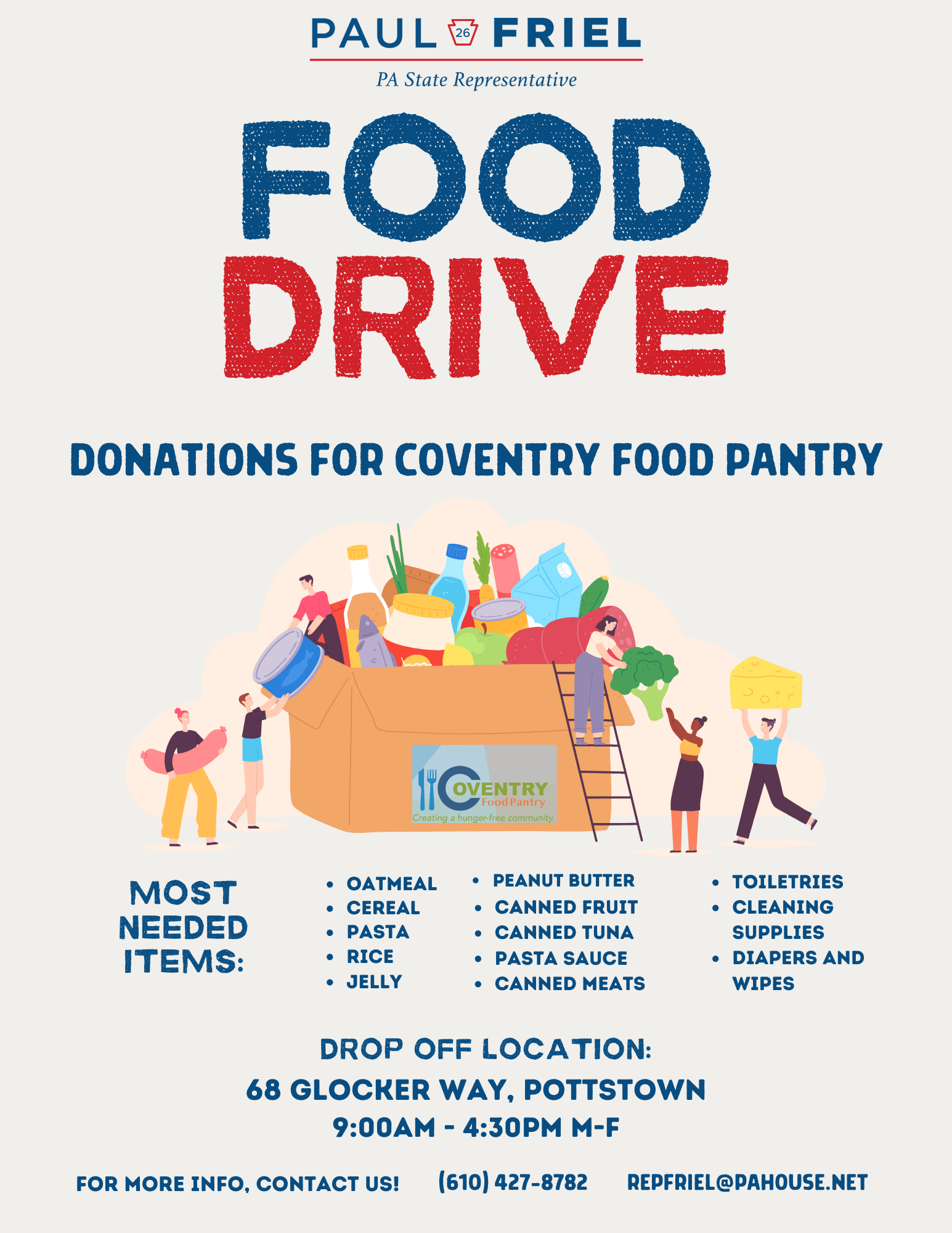 Our office is collecting food for the Coventry Food Pantry, which serves the Owen J. Roberts School District area. Please stop by between 9 a.m. and 4:30 p.m. Monday through Friday to drop off items for our neighbors in need.