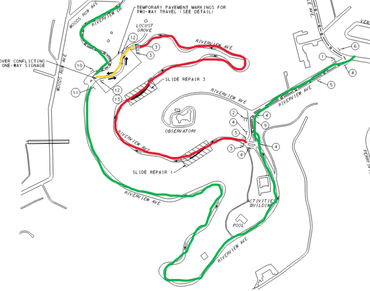 Please be advised that now through November 7, Riverview Avenue in Riverview Park will be closed to vehicular traffic beyond the Observatory and Activities Building entrances to Locust Grove to allow for work to remediate areas of the park affected by landslides.