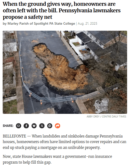 When these natural disasters occur, as they often do here in Allegheny County, homeowners are often left footing the bill because there are no options to purchase landslide or sinkhole insurance. That’s why I’m proposing this safety net bill: to fill gaps in an area neglected by private insurers.