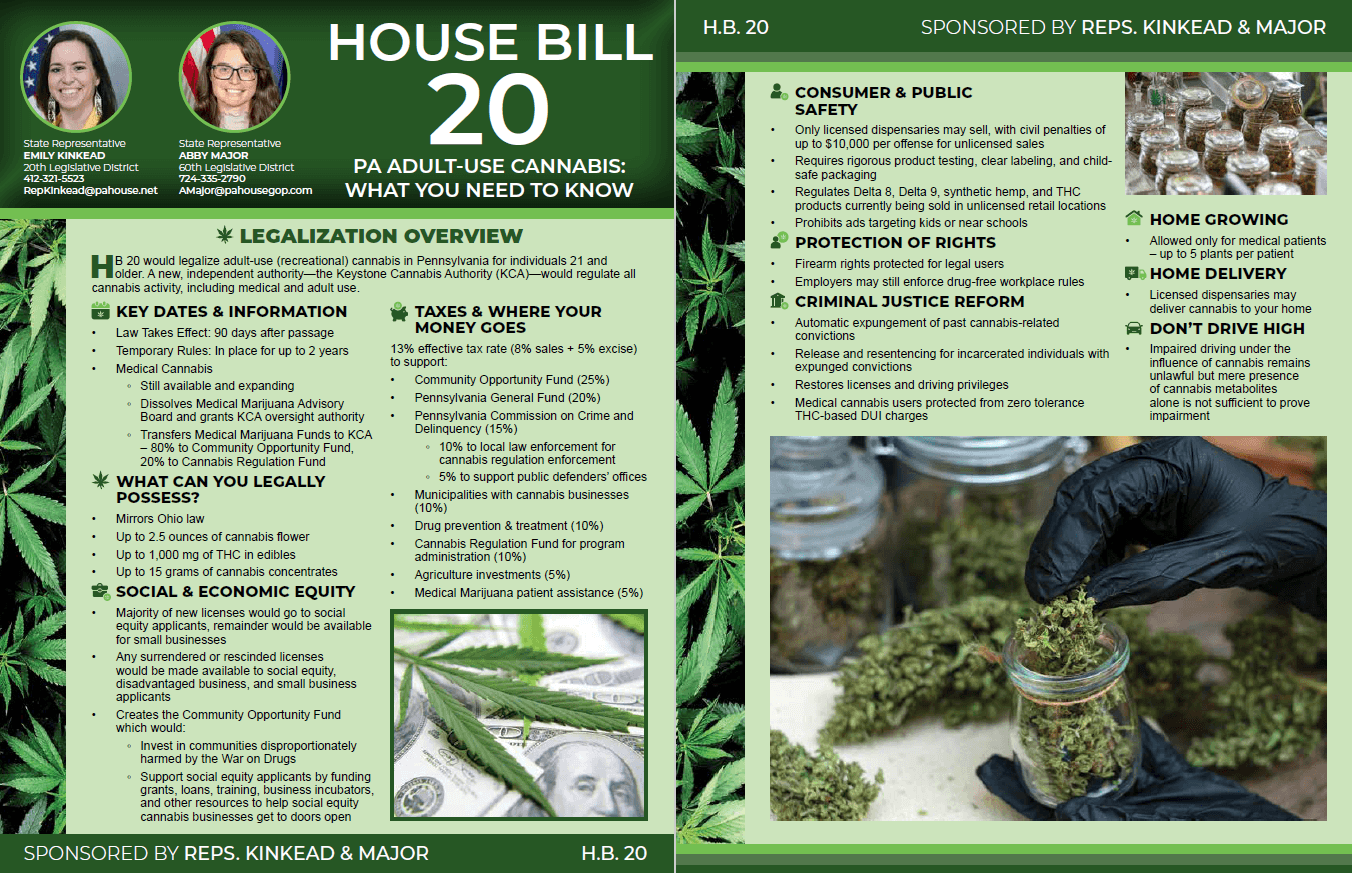 I have once again introduced bipartisan legislation (H.B. 20) to legalize adult-use cannabis in Pennsylvania. My office has put together a new one-page explainer that breaks down what’s in the bill, now available on my website.