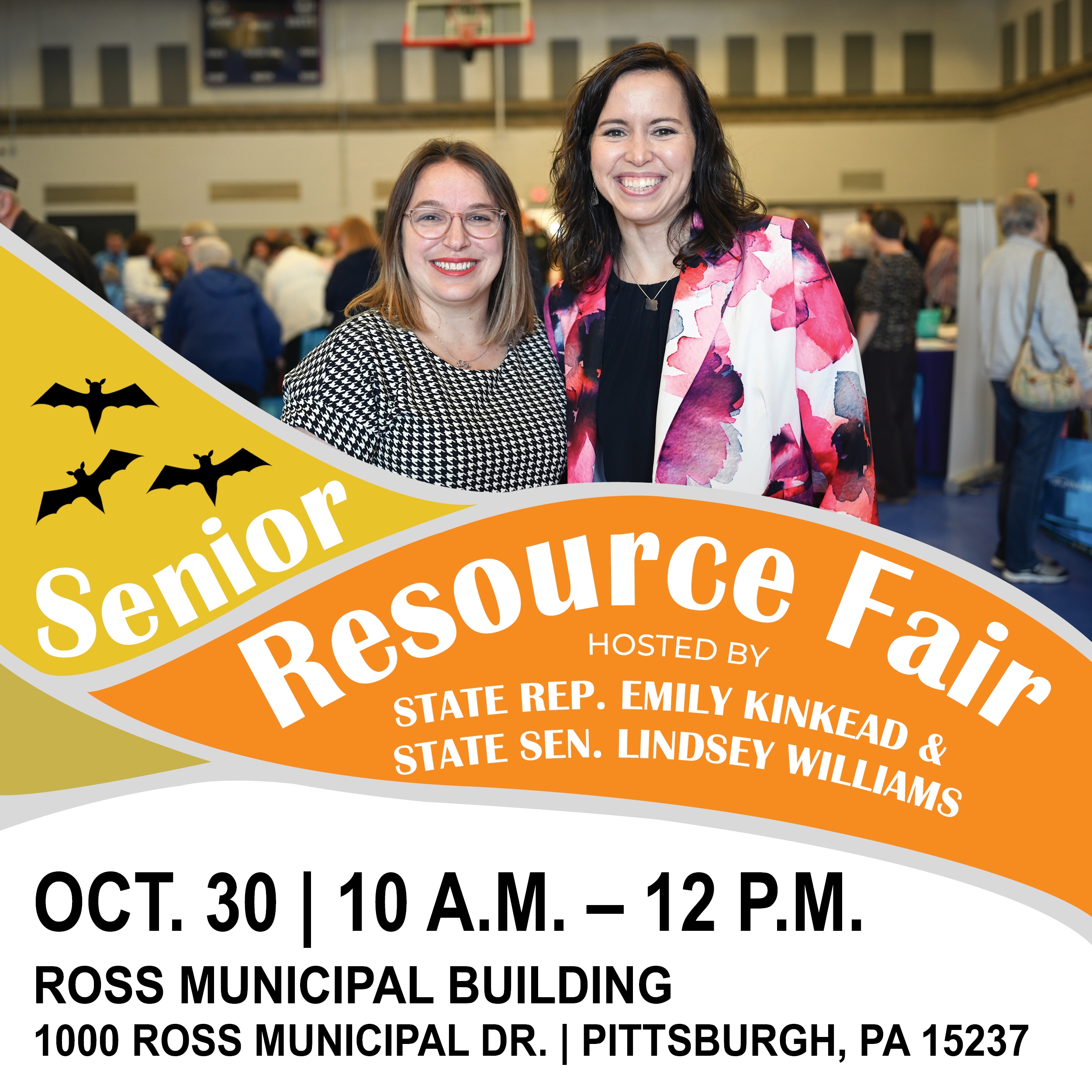 Spooky season is almost here, and so is my annual Senior Resource Fair with Senator Lindsey Williams! Join us from 10 a.m. to noon on Thursday, Oct. 30 at the Ross Township Community Center (1000 Ross Municipal Drive, Pittsburgh, PA 15237).