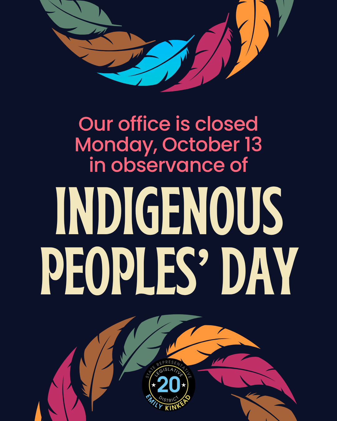 Please note that my office will be closed on Monday, October 13 in observance of Indigenous Peoples’ Day and will reopen on Tuesday, October 14.