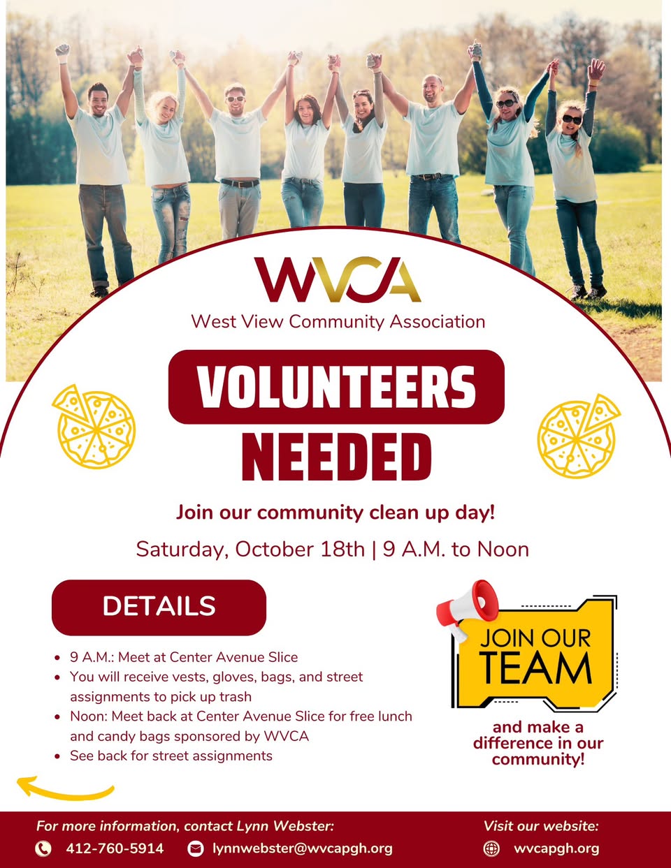 Volunteers are needed for West View’s Community Clean Up Day on October 18. Contact lynnwebster@wvcapgh.org for more information.