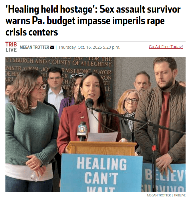 On Thursday, I joined advocates and survivors at a rally calling for immediate action to pass the state budget and deliver the funding our rape crisis centers need. Pittsburgh Action Against Rape and centers like it provide lifesaving support. They should not be forced to choose between paying staff and answering calls for help.