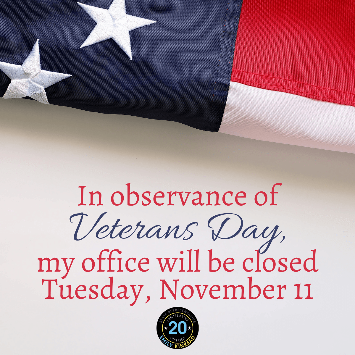 Please note that my office will be closed on Tuesday, November 11 for Veterans Day.