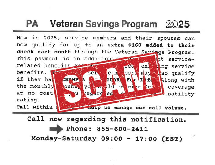 If you or a veteran you know is ever unsure about a notice or offer like this, please contact the DMVA at 800-547-2838 to discuss it with an accredited veteran service officer at no cost.