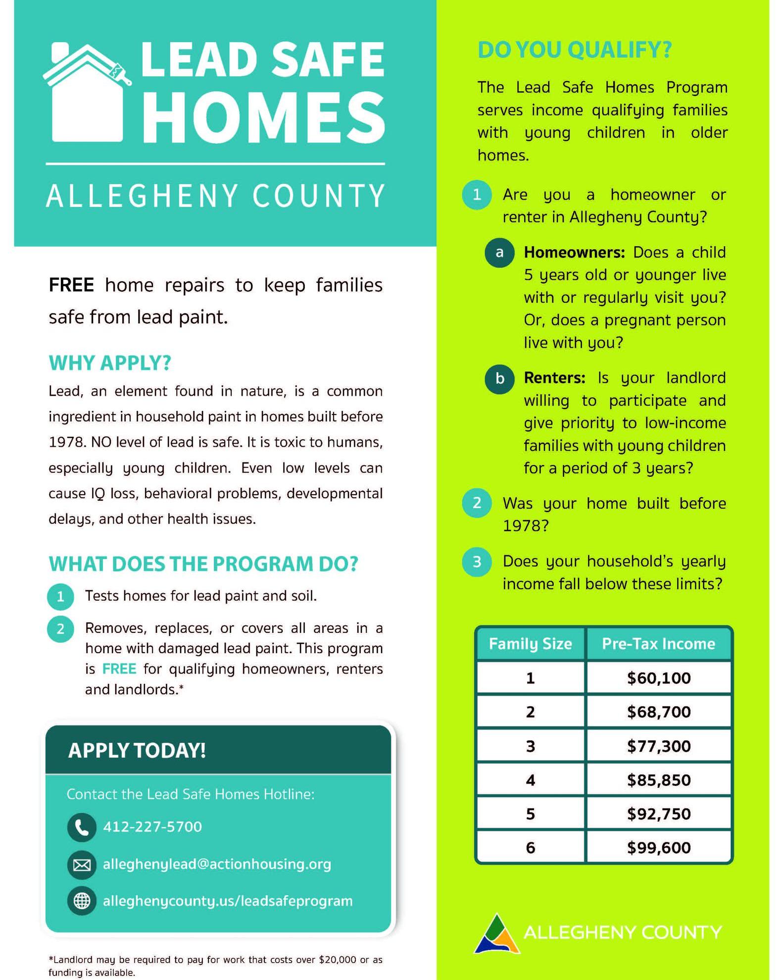 For more information, call the Lead Safe Homes Hotline at (412) 227-5700 or visit alleghenycounty.us/leadsafeprogram.