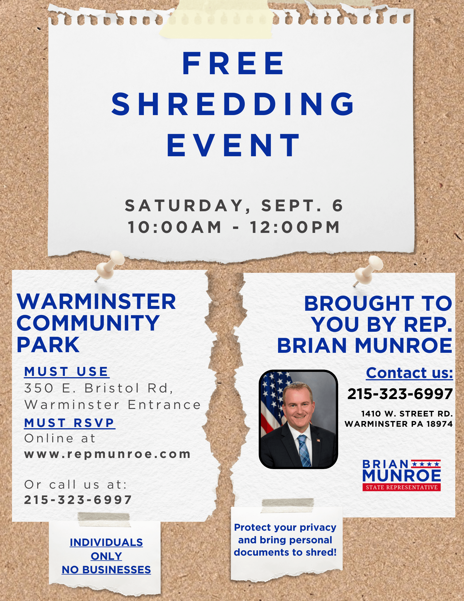 Join us tomorrow in Warminster Community Park from 10 a.m. to noon for our fall shredding event! Open to households only – no businesses, please – this event is a great way to dispose of unneeded personal documents and protect your identity. RSVP here.