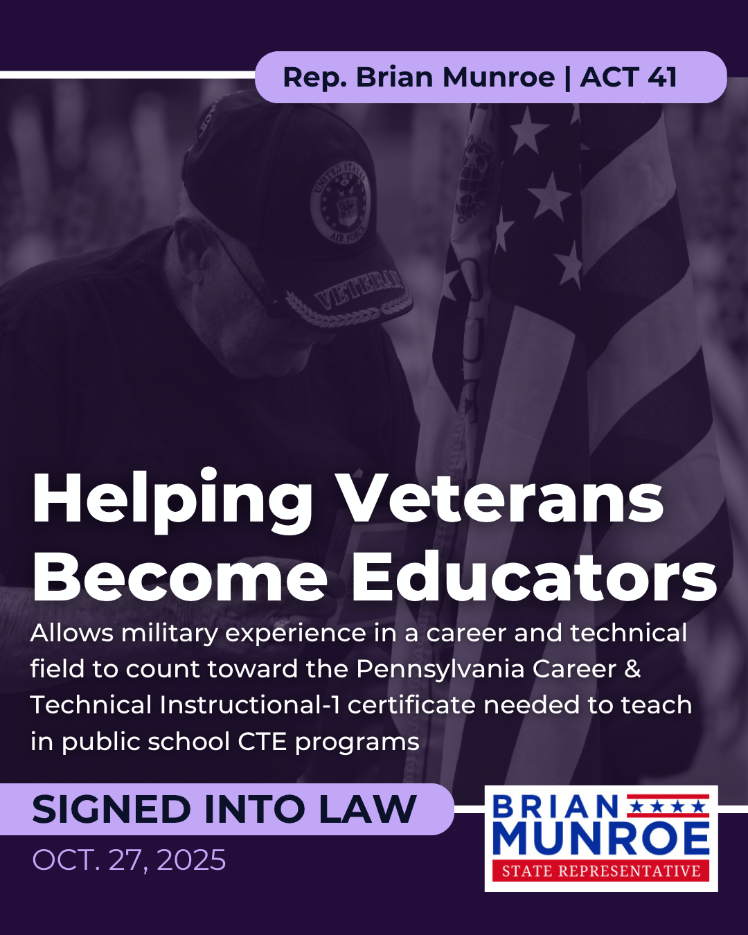 I’m proud to share that my legislation, Act 41 of 2025, formerly House Bill 1405, was signed into law by Governor Shapiro on Monday! This new law gives veterans a smoother path toward Pennsylvania Career & Technical Instructor-1 certification, the license needed to teach in CTE fields in our public schools. CTE programs prepare students for careers in manufacturing, healthcare, I.T., agriculture, construction, and more.