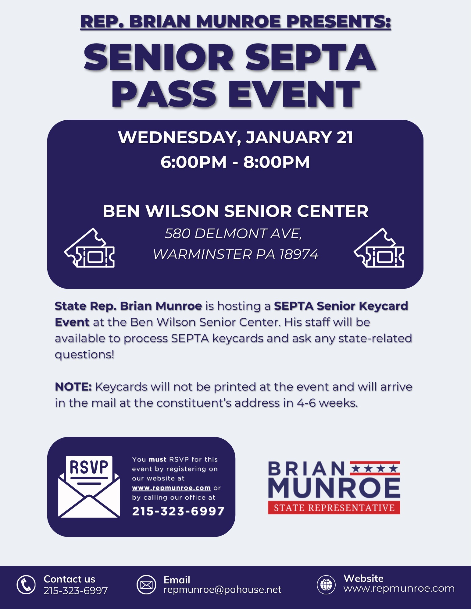Our SEPTA Senior Pass event is almost here! If you haven’t already, register now to join us at the Ben Wilson Senior Center next Wednesday, January 21 to sign up for your SEPTA Senior Pass, which gets residents age 65+ free fare on all SEPTA lines.