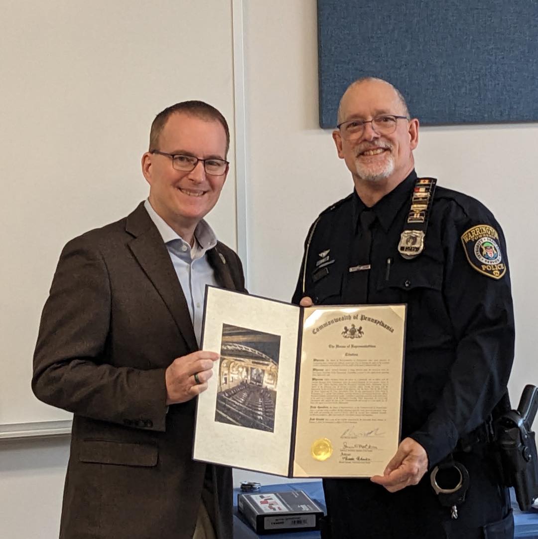 I recently honored Officer Richard Hackman with a House citation for his retirement from the Warrington Township Police Department after 38 total years in law enforcement. Officer Hackman spent 28 of those 38 years with the Warrington team. During his time in Warrington, he served on the Highway Unit, Motor Unit, Honor Guard, and the SWAT and Crisis Intervention teams.