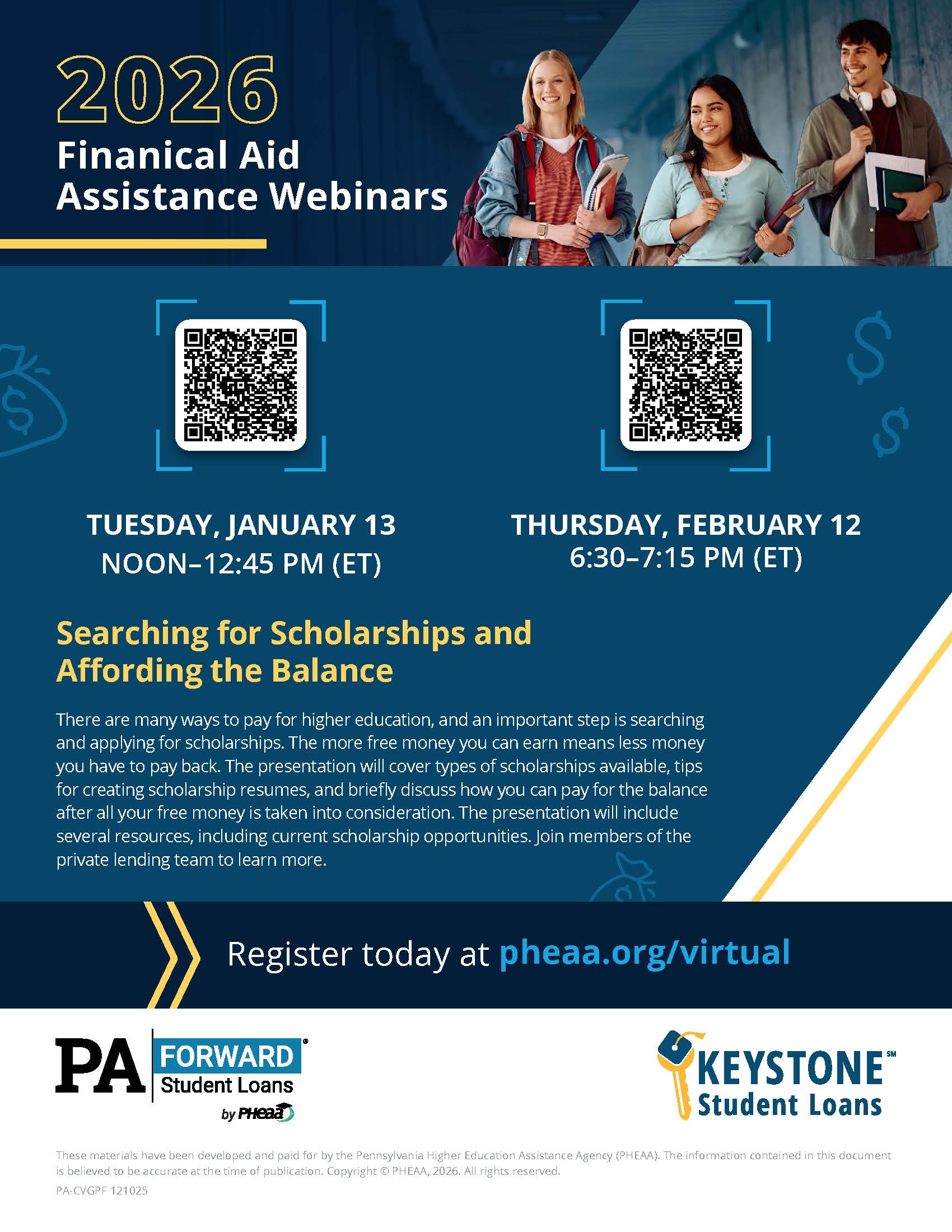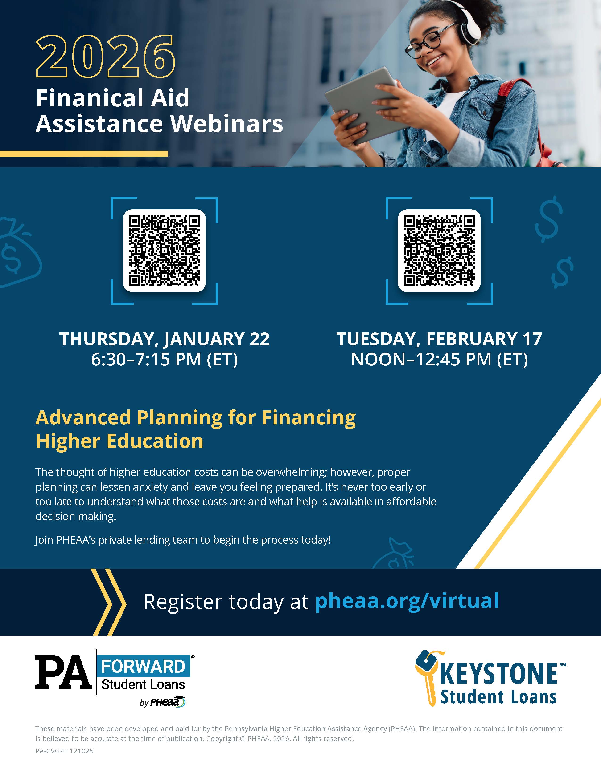 The Pennsylvania Higher Education Assistance Agency is hosting a series of webinars to help you plan for and afford higher education. Starting January 13, the series will cover two topics: Searching for Scholarships and Affording the Balance, and Advanced Planning for Financing Higher Education.