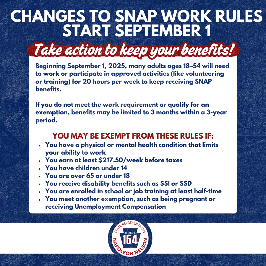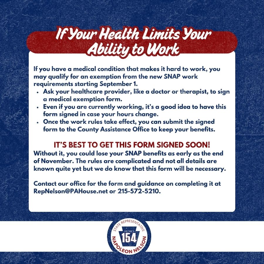 If you have a health condition that makes it difficult to work, you may be able to get an exemption from the new SNAP work requirements starting September 1.   You can act now by asking your doctor or other healthcare provider to sign a medical exemption form. Having this form ready before the rules begin could help prevent an interruption in your benefits later this year.   For the form and help completing it, contact our office or your County Assistance Office. |