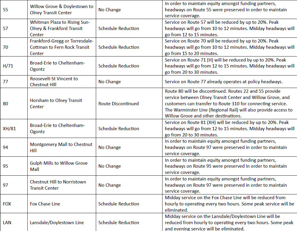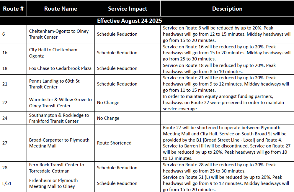 Neighbors, starting this month, SEPTA will be making significant service adjustments and fare increases that could affect your daily travel. We will start to see service cuts to SEPTA begin on Monday, August 25, and fare increases begin on Monday, September 1. I want to make sure you’re prepared so you can plan ahead for work, school, and other commitments.   Below are how the routes in our district will be impacted starting Monday. |