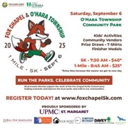The Fox Chapel Parks Committee is hosting a 1-mile and 5K race this Saturday, September 6, at the O’Hara Township Community Park. Please see the flyer above for the corresponding race times and entry fees (subject to change). There will be kids’ activities, community vendors, prize drawings, t-shirts, and more! Register now to run through the parks and celebrate community: www.foxchapel5k.com.