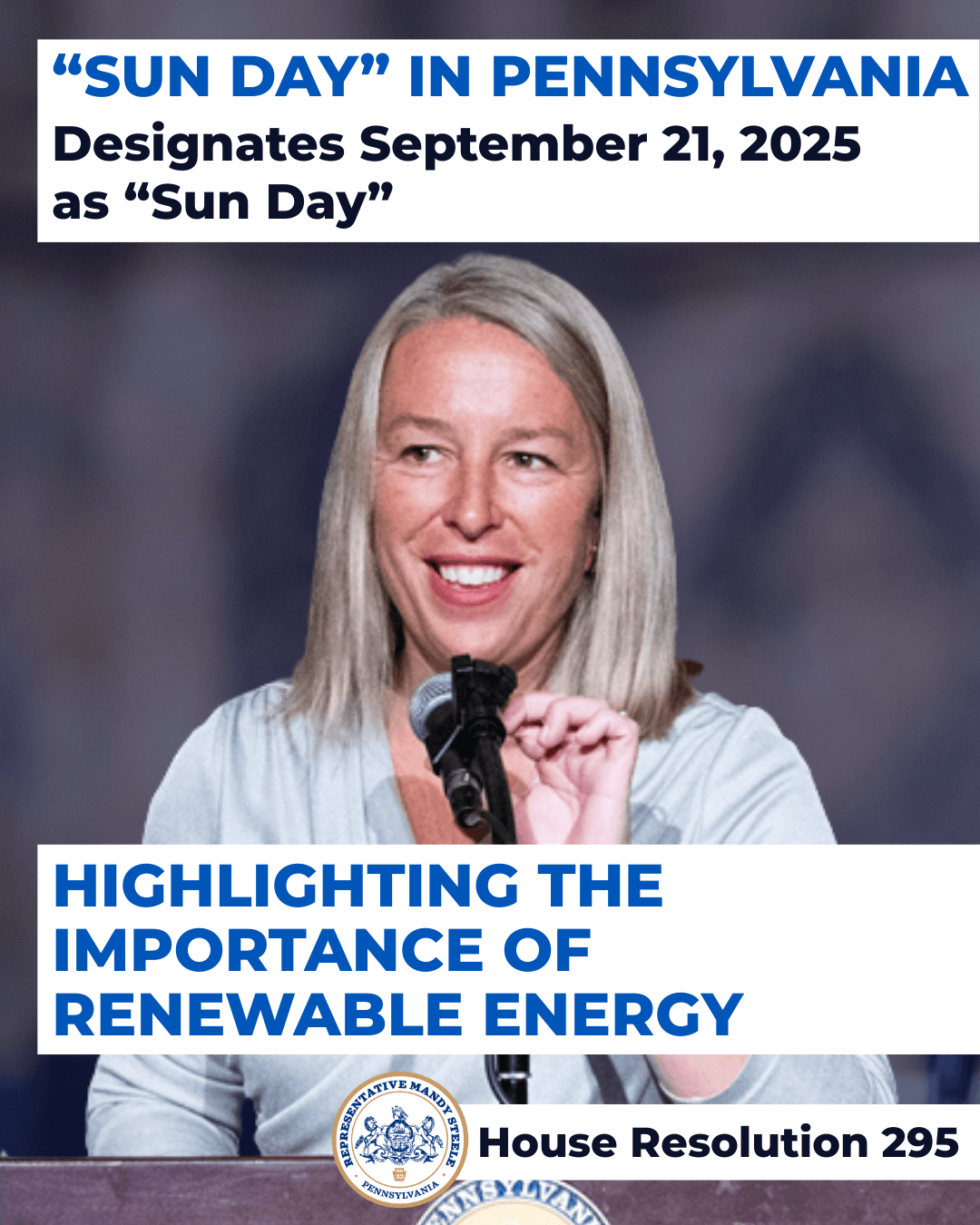 Pennsylvania needs to produce more energy NOW to decrease the strain on our energy grid and protect our communities from rising energy costs. This past Sunday, September 21, was Sun Day, a National Day of Action that promotes clean, renewable energy. I have introduced House Resolution 295 designating September 21 as Sun Day in Pennsylvania, highlighting the importance of expanding renewables in our Commonwealth. Read more about renewables and the state of our energy grid here.