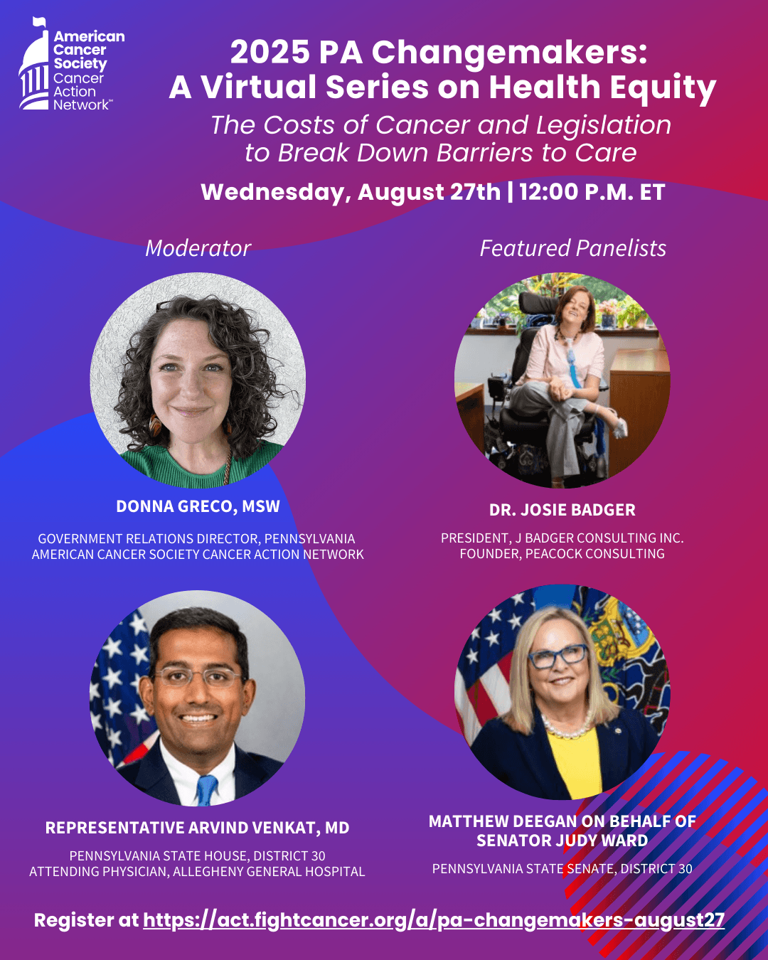 I will be serving as a panelist for the American Cancer Society’s Virtual Series on Health Equity where we will be discussing the costs of cancer, and how legislation can break down barriers to care.