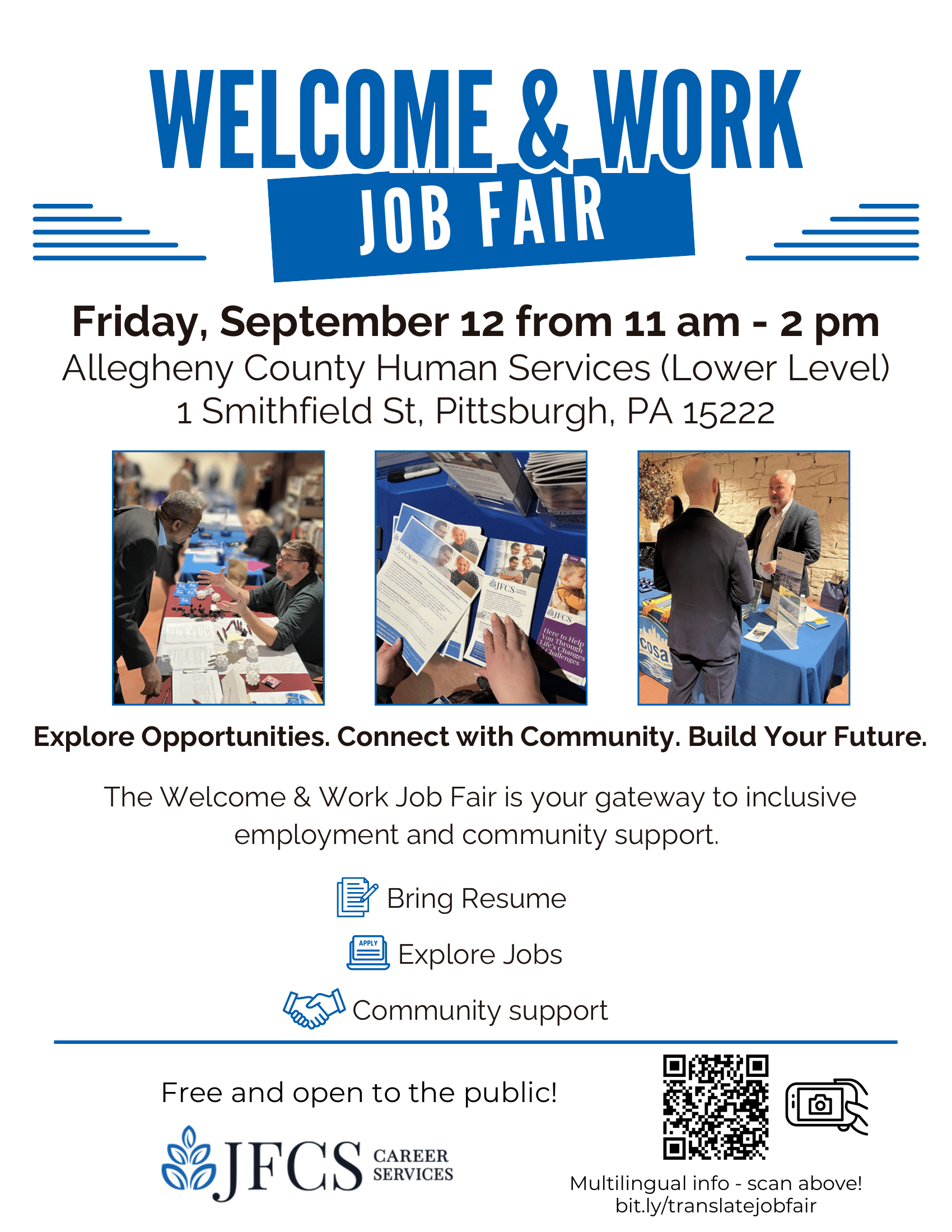 JFCS will also be hosting a Welcome & Work Job Fair on Friday, September 12 at the lower level of Allegheny County Human Services. They will have the opportunity to circulate your resume and explore potential careers in our community.