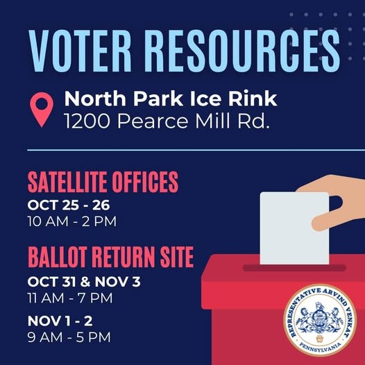 The deadline to request a mail-in ballot for the November 4th election is coming up. If you want to vote by mail, you must request a ballot by 5 PM on Tuesday, October 28th. You can either mail your ballot in or return it to one of several drop boxes in the county, including at North Park Ice Rink (1200 Pearce Mill Rd.) in our district. |