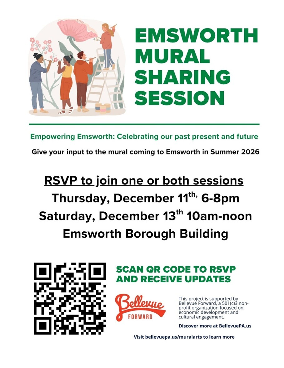 Bellevue Forward will be hosting input sessions on a mural that is planned to go up in Emsworth during summer 2026. There will be two sessions, December 11th from 6 – 8 PM and December 13th from 10 AM – noon, both at the Emsworth Borough Building. More details and the RSVP form can be found here. |