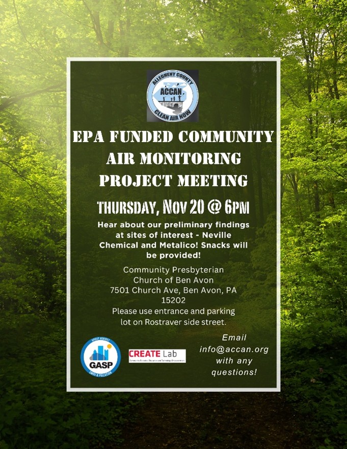Allegheny County Clean Air Now will be hosting an EPA-funded community air monitoring project meeting to discuss their preliminary findings. The event will be on Thursday, November 20 at 6 PM at the Community Presbyterian Church of Ben Avon (7501 Church Ave).