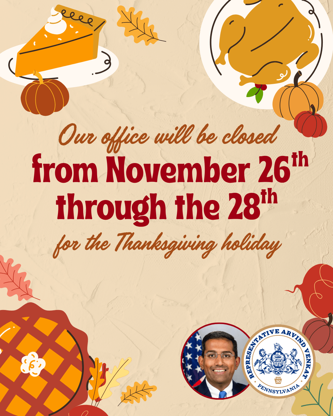 If you need assistance with any state-related issues during the time we are closed, please leave a message at (412) 348-8028 or email us at repvenkat@pahouse.net. We will contact you once we reopen on Monday.