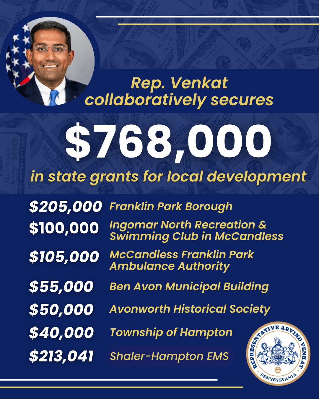 I am proud to have partnered with Senators Williams, Robinson, and Fontana as well as Reps. Powell and Shaffer to secure over $750,000 in grant funding for our community. This funding will support critical projects for recreational facilities, borough buildings, infrastructure, parks & playgrounds, and emergency medical services. You can learn more about these projects here.