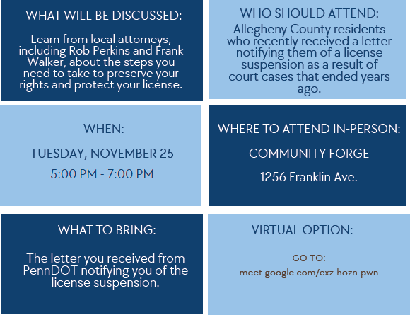 There will be a meeting to help appeal these suspensions held by the Allegheny Lawyers Initiative for Justice and Frank Walker Law on Tuesday, November 25 from 5 – 7 p.m. at Community Forge (1256 Franklin Ave., Wilkinsburg). You can also join the meeting virtually here. You will need to bring the PennDOT letter notifying you of your suspension.