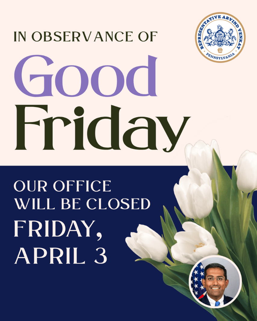 If you need assistance during that time, please call my office at (412) 348-8028 or email RepVenkat@pahouse.net, and my staff will get back to you once we reopen.