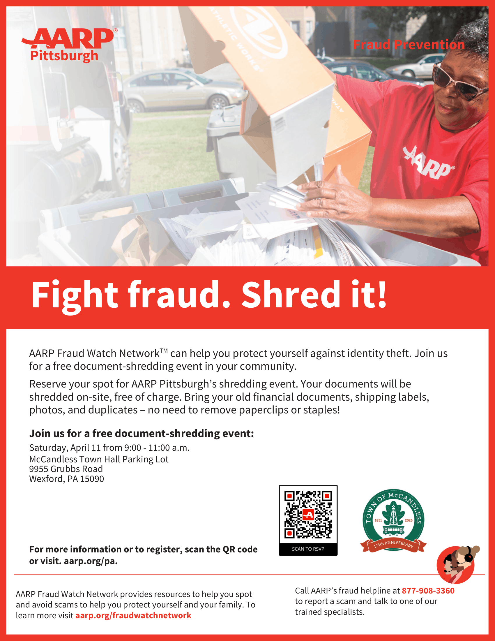 If you could not make it to my recent shred event, another will be available locally soon! AARP Pittsburgh will be hosting a document shredding event to safely dispose of sensitive documents on Saturday, April 11 in the McCandless Town Hall Parking Lot (9955 Grubbs Road).