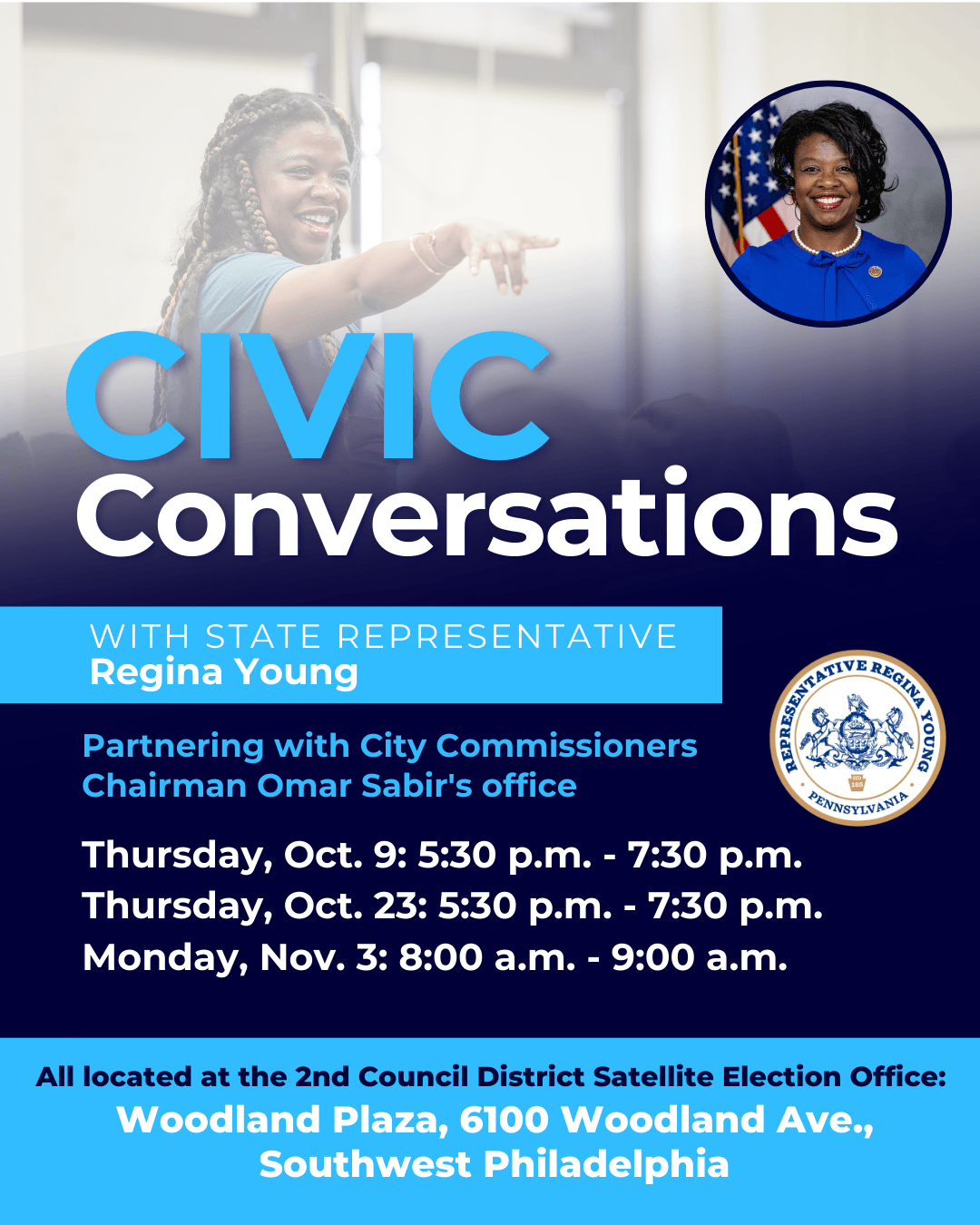 I’m kicking off this fall with a return of my Civic Conversations series. I’m partnering with Philadelphia City Commissioner Chairman Omar Sabir to present these gatherings to help you learn about how your government works for YOU and the importance of getting involved and ensuring your make your voice heard with your vote.