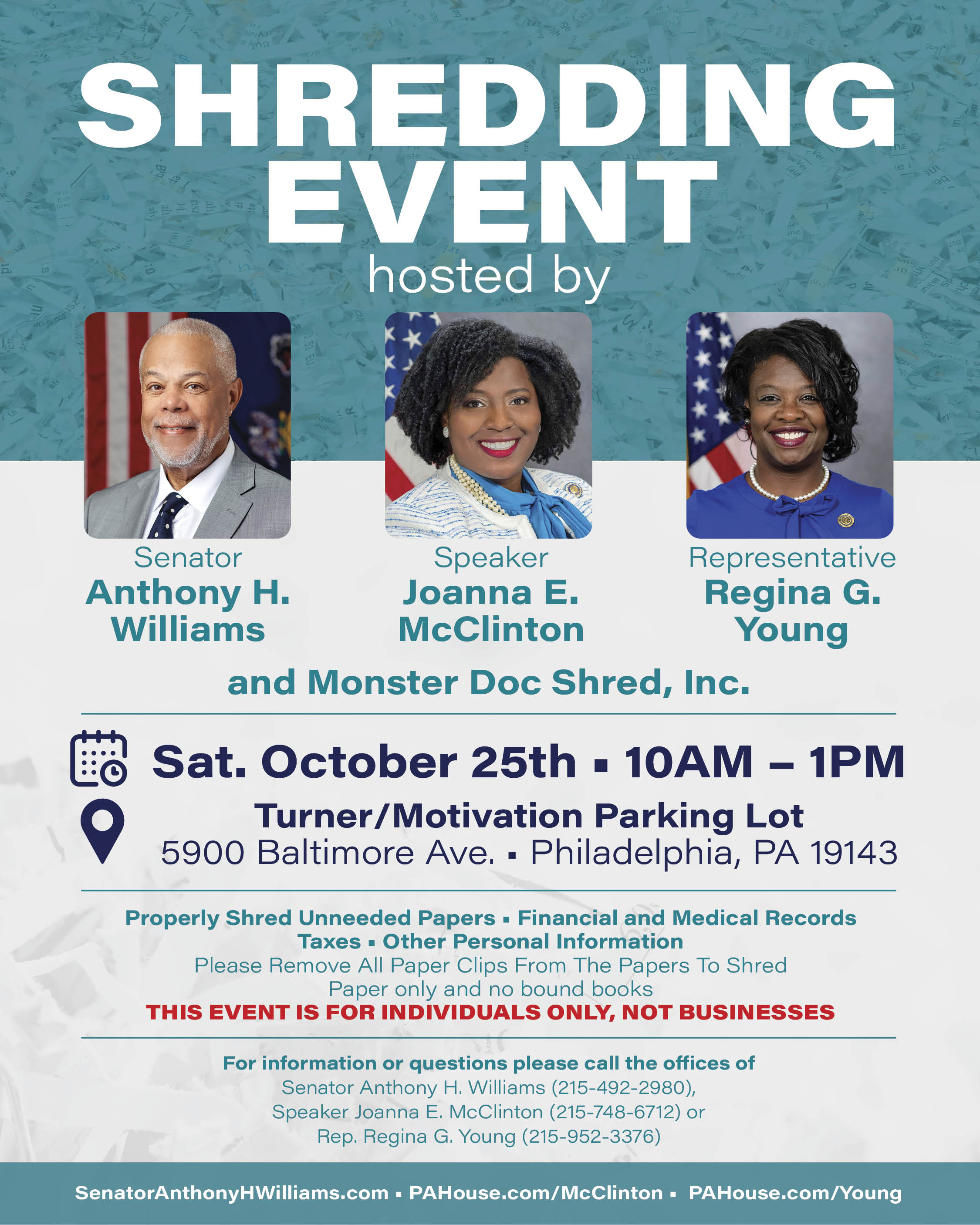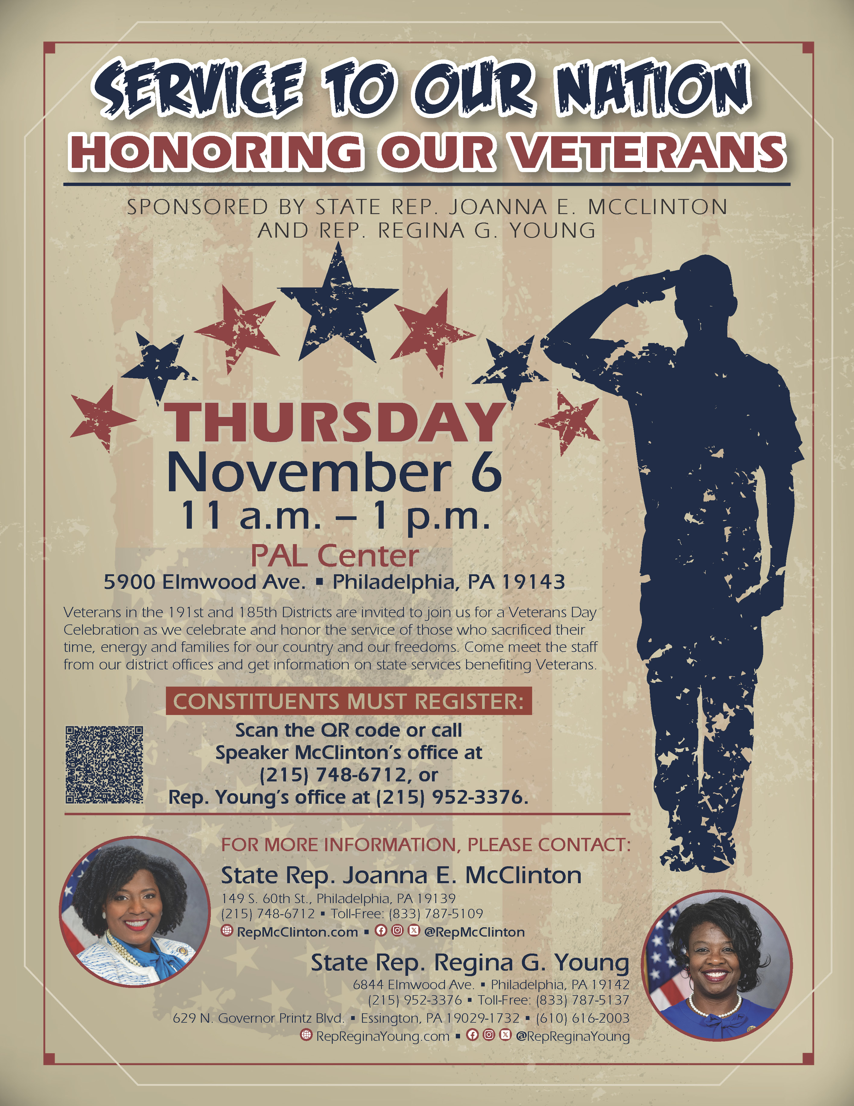 I’m joining Speaker Joanna McClinton to honor veterans from our area for their service and sacrifice. If you or your loved one served our country, we want to give you the recognition you deserve! Contact my office to register for our event happening on Thursday, Nov. 6 from 11 a.m. until 1 p.m. at the PAL Center, 5900 Elmwood Ave. in Southwest Philadelphia.