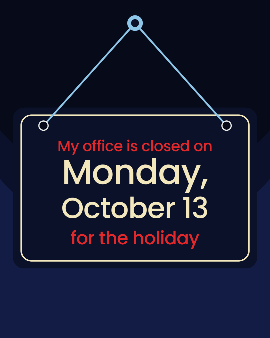 My offices will be closed on Monday, Oct. 13. We look forward to serving you when we reopen on Tuesday morning!