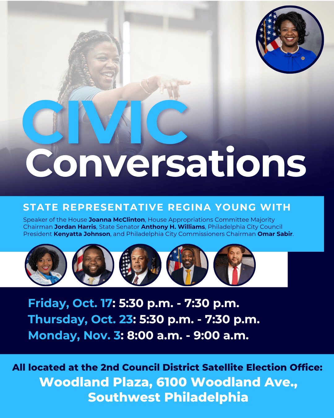 I’m kicking off this fall with the return of my Civic Conversations series. I’m partnering with local and state leaders to host these gatherings, designed to help you understand how your government works for YOU and the importance of getting involved—ensuring your voice is heard through your vote. Joining me for these conversations will be Philadelphia City Commissioner Chairman Omar Sabir, City Council President Kenyatta Johnson, and my colleagues and leaders from the state House who also represent parts of Delco, South, and Southwest Philadelphia: Speaker Joanna McClinton and Appropriations Chairman Jordan Harris.